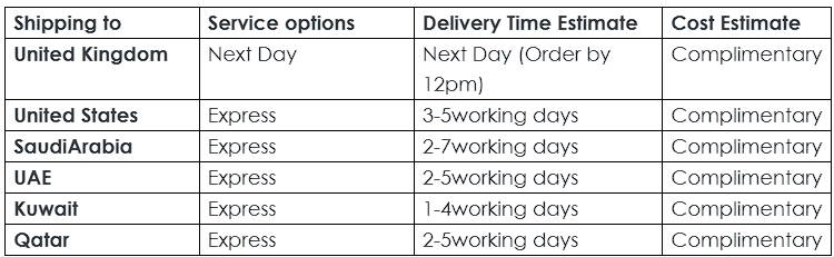 Enjoy complimentary returns on all UK orders. Next Dayshipping only available in UK Mainland. UK Next Day Delivery will arrive thenext working day if placed before 6 PM GMT, Monday to Friday. Orders placed after 6 PM GMT or on weekends andpublic holidays will be processed on the following working day.