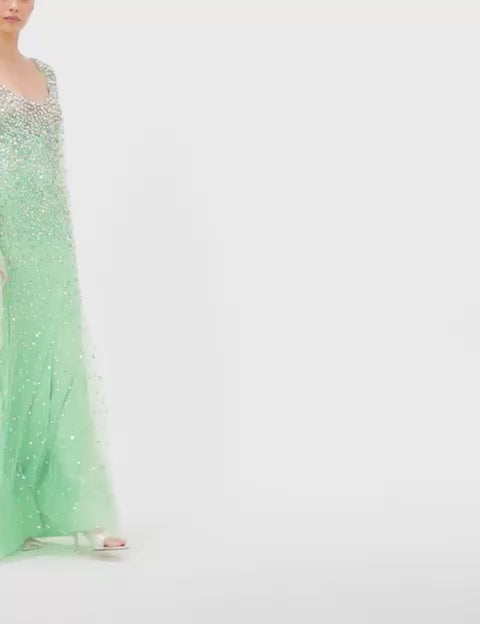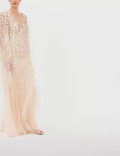 Angel Wing is a floor-length designer gown that combines ethereal elegance with radiant embellishment. The sheer, layered sleeves float with each movement, bringing an airy grace to this otherwise richly detailed piece. Thousands of sequins and crystals create an exquisite ombré effect, catching the light from every angle. Designed to contour gently along the body, this luxury evening dress offers a flattering silhouette that’s both refined and dramatic. The scoop neckline lends a modern touch of simplicity, drawing attention to the collarbone. This show-stopping gown is ideal for high-profile galas, red carpet events, black-tie weddings, or formal receptions that call for an unforgettable look. Angel Wing is a celebration of craftsmanship and couture-level glamour — a true masterpiece for events that demand statement-making style with refined allure.