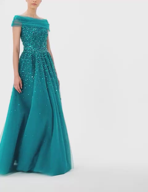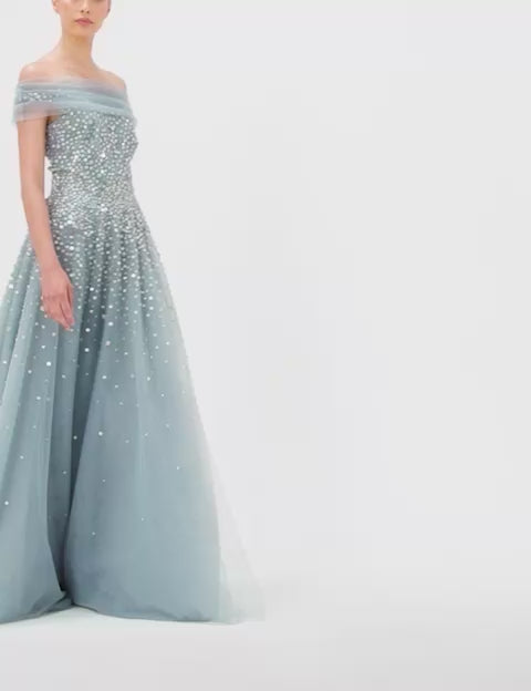 Bee is a vision of modern romance, crafted with elegance and ease in mind. This off-shoulder designer gown combines a clean, sculpted neckline with a voluminous tulle skirt that moves with soft drama. The bodice is intricately embellished with reflective crystals, densely packed across the top and gradually diffusing downward, creating a captivating gradient of light. The sparkling embellishment lends the dress a celestial quality, while the layered tulle adds airiness and movement. This gown is ideal for romantic weddings, formal receptions, black-tie galas, or even engagement photo shoots where soft glamour is desired. Designed to flatter from every angle, Bee effortlessly blends high-impact detail with ethereal lightness, offering a graceful alternative to traditional eveningwear. Whether you’re walking down the aisle or gliding across the ballroom floor, this gown ensures your presence is unforgettable.