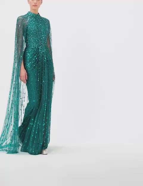 Vibrant, bold, and unforgettable, the Cairo mini dress is crafted for celebrations and evenings where every detail matters. Featuring a fitted bodice with a plunging neckline and a daring crossover back, this dress flatters the figure while adding a contemporary twist. The densely packed sequins create a textured, light-catching effect that dazzles from every angle, while the softly gathered waist ensures a balanced, flattering silhouette. The pièce de résistance is the sheer, floor-length cape adorned with matching sequins, creating a stunning layered effect and a dramatic entrance. Pair with strappy stilettos, statement earrings, and a bold lip to amplify its party-ready glamour. Ideal for cocktail parties, high-profile social events, evening receptions, or special occasions where making a grand impression is essential, the Cairo dress is designed for women who embrace bold elegance and a playful, confident aesthetic.