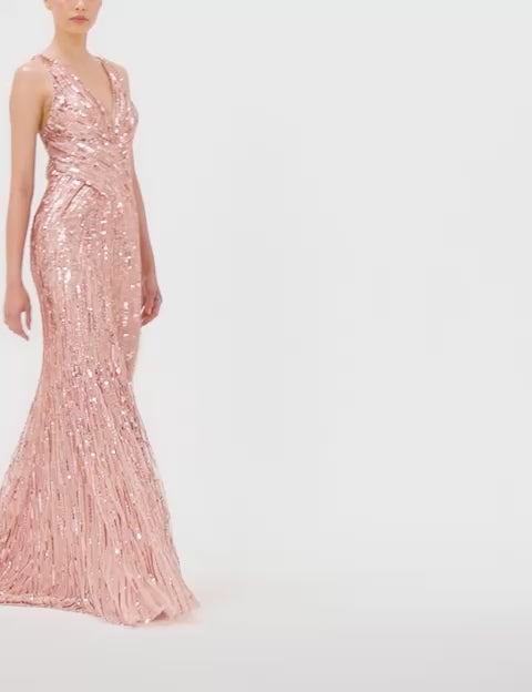 Modern glamour takes centre stage in the Luxor gown by Jenny Packham. This sleek, sculpted silhouette is designed to contour and flatter the body with precise placement of sequins that elongate and define. Featuring a plunging neckline and a tailored fit that subtly flares at the hem, Luxor is the epitome of elegant seduction. Each embellishment is meticulously arranged to highlight the natural curves and bring architectural structure to the piece. Designed for after-dark sophistication, this gown is perfect for upscale cocktail evenings, fashion-forward galas, or black-tie events that call for unapologetic glamour. Its minimalist shape allows the shimmering detail to shine, creating a look that’s both powerful and polished. Whether on the runway or at a high-profile celebration, Luxor is a bold, confident choice for women who dress with intention and impact.