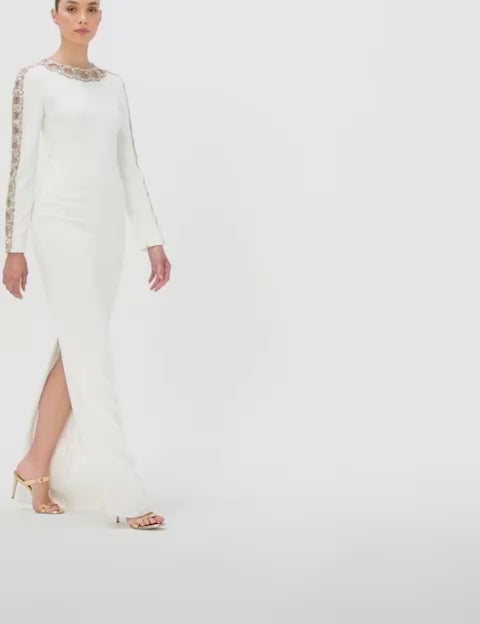 Redefining refined luxury, the Penny gown from Jenny Packham is an elegant expression of modern femininity and timeless style. This statuesque, floor-length gown features a sleek, form-fitting silhouette that drapes beautifully, enhancing natural curves while maintaining graceful fluidity. Intricate crystal embellishments frame the neckline and cascade delicately down the openwork sleeves, creating visual interest and luminous depth. The detailed embroidery is both subtle and impactful, glimmering under evening lights for a soft, sophisticated effect. Designed for high-end occasions like formal weddings, luxury banquets, award nights, or cultural galas, the Penny gown strikes the perfect balance between classic structure and contemporary finesse. It’s ideal for women who value thoughtful craftsmanship, understated glamour, and couture design. With its quiet confidence and precise artistry, Penny is a refined choice for moments that call for unforgettable elegance.