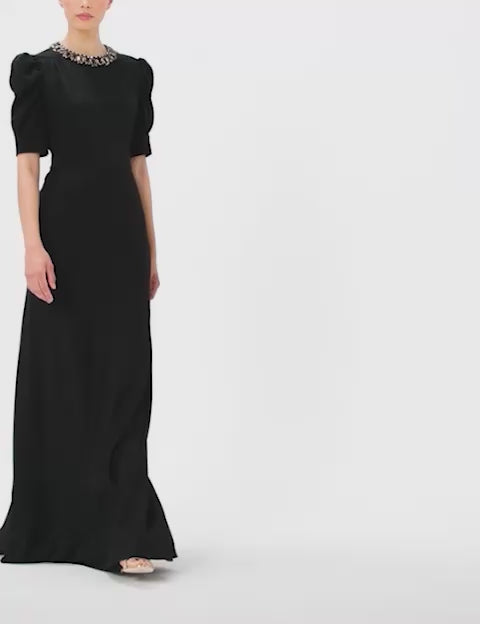Sea Daisy is the epitome of commanding elegance and modern sophistication. Its sculpted bodice cinches the waist, flowing seamlessly into a floor-length silhouette that moves with a liquid-like grace, offering a figure-flattering and effortlessly striking presence. Puffed sleeves introduce a soft, sculptural volume, balancing the gown’s sleek lines with romantic structure. A crystal-embellished neckline serves as a luminous focal point, catching light with every step and enhancing the wearer’s natural poise. Styling options include metallic heels, a coordinating clutch, and minimalist jewellery to allow the gown’s intricate details to shine. Hair can be worn in soft waves or an elegant updo to complement the neckline and shoulder design. Ideal for black-tie galas, red carpet events, formal dinners, or high-profile celebrations, Sea Daisy combines timeless glamour, architectural elegance, and modern allure, ensuring an unforgettable entrance wherever it is worn.